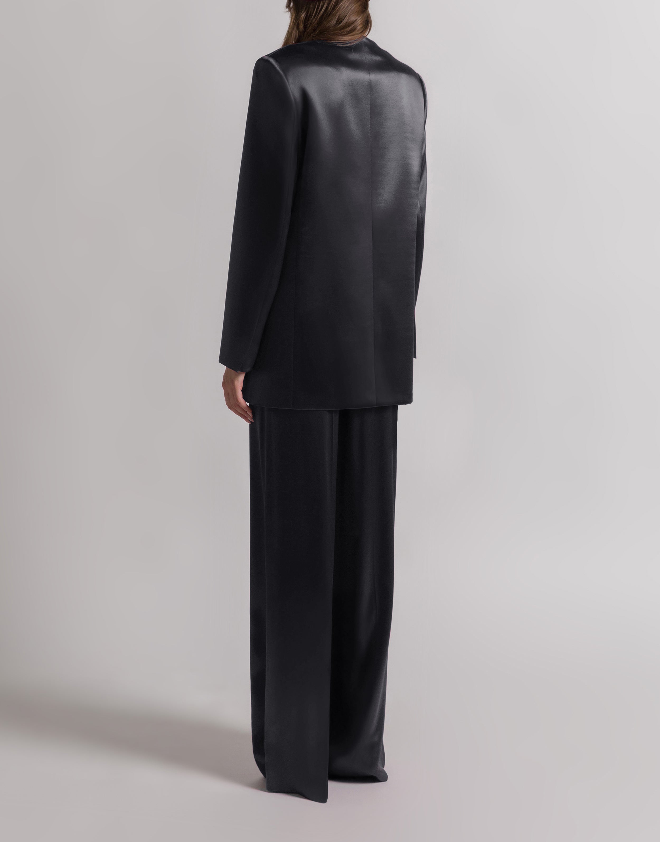 La nuova sartoria. Elegante giacca da abito a doppiopetto realizzata in raso liscio e lucido. Abbinala al pantalone coordinato per un look perfettamente armonioso.